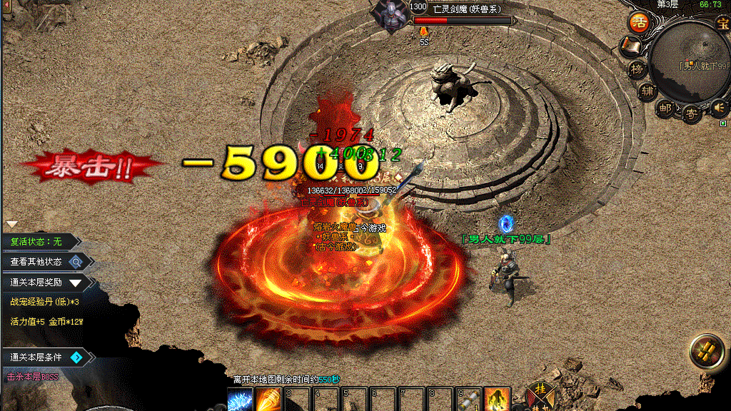 每天的每日副本和材料副本都记得一定要刷,材料副本需要活力值才可以进入,下99层的时候每下一层除了有宠物丹奖励之外还会有活力值奖励,个人活力值最高存储是72点,所以下层的时候要注意自身的活力值,快满的时候建议就去打下材料副本,否则爆掉的活力值就实属浪费了。另外,地图中的BOSS在击杀到一定次数以后也会掉落活力值。