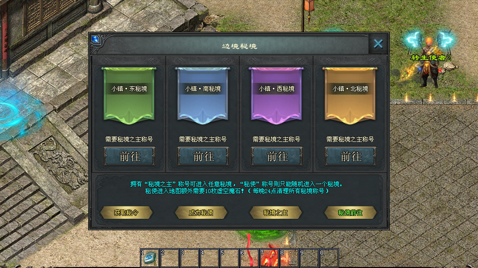 在边境小镇(第二大陆)安全区左侧边境秘境NPC、沙漠绿洲(第三大陆)安全区下方沙洲秘境NPC处,秘境分为东、南、西、北4个区域,秘境内有强力BOSS和高级怪,击杀它们能获得各种货币和强力装备。消耗虚空魔石、边境文书(打怪掉落)、赞扎之光/赞扎之魂锻造边境秘令,使用获取【秘使】或【秘境之主】称号,秘使可花费10虚空魔石随机进入1个秘境,秘境之主自由进入任意秘境,秘境称号每晚24点清空。