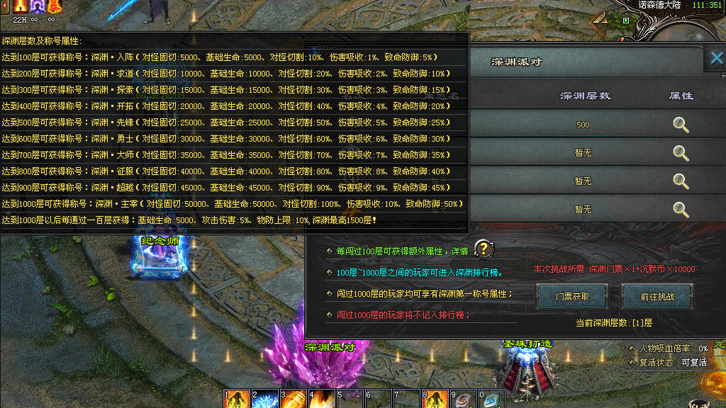 在诺森德大陆(第四大陆)安全区下方深渊派对NPC处,消耗源质铸块、赞扎之光、赞扎之魂,或能量水晶、金条兑换深渊门票。所需材料均可打怪获得。消耗深渊门票、沉默币进入挑战地图,每闯过100层可获得对怪固切、基础生命、对怪切割、伤害吸收、致命防御等额外属性加成,最高1500层。闯至100-1000层之间可进入深渊排行榜,前4名可获得对应的打怪爆率、生命、攻击属性加成,排名越靠前属性越好。闯至1000层后会获得【深渊第一】称号,获得打怪爆率288%、最终生命+10%、最终攻击+10%,同时不再计入深渊排行榜。