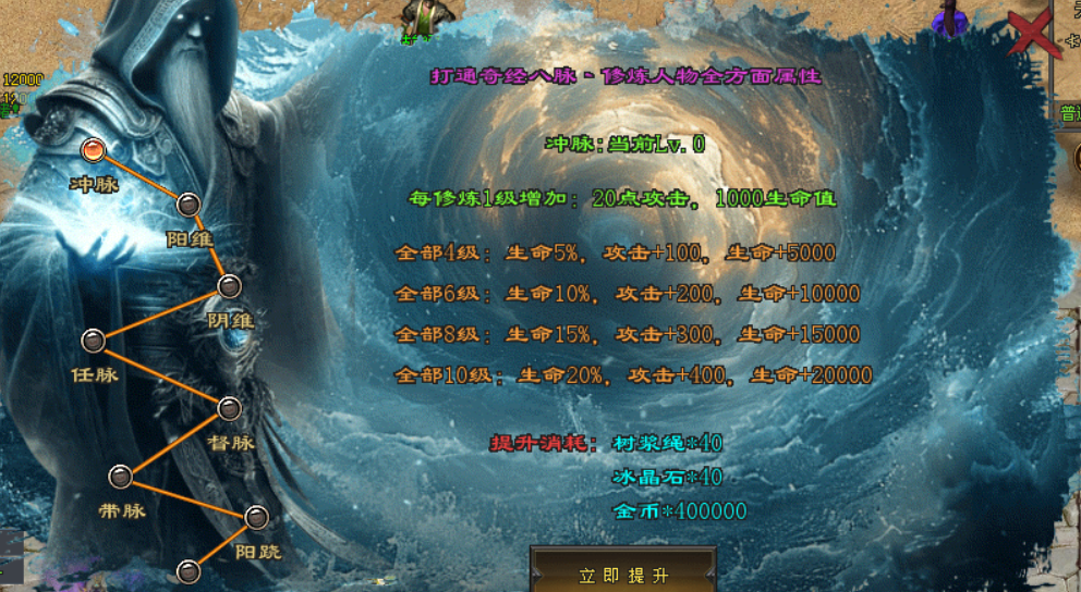 该版本新增奇经八脉玩法,玩家可通过消耗货币及材料打通奇经八脉,获得强力属性加成。