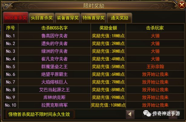 为了使散人更好的发展,游戏设有BOSS首杀、头目首杀、装备首穿、地图通关等多种奖励,可获得大量充值点及元宝,散人打金好发展。