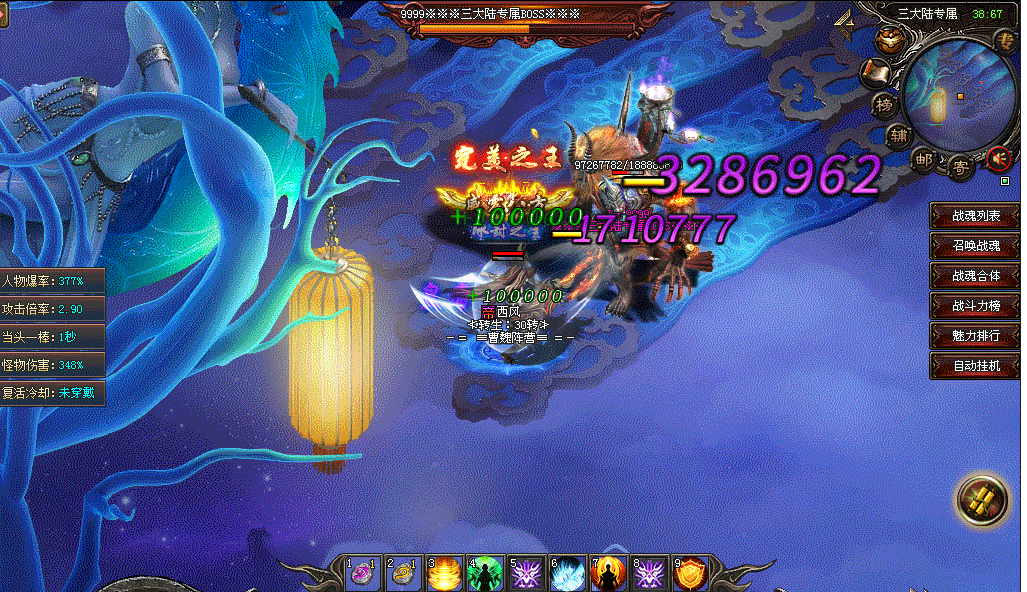2、送3888充值、个人首杀首爆、送自动回收、切割、极限攻速、打怪效率高;