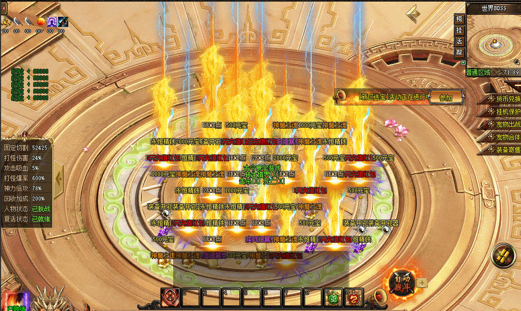 当然进地图前不要忘记开启“狂暴之力”和“神歌赞助”,获得攻速、倍攻、切割及爆率等BUFF加成,装备满屏等着你!