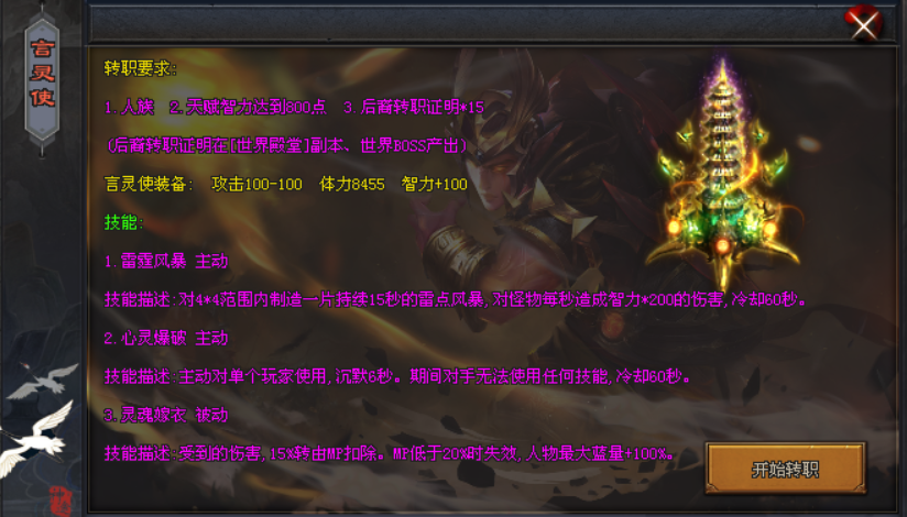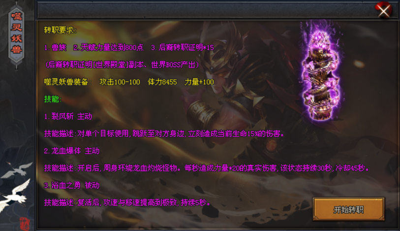 【兽族】:极强伤害技能,PK有优势,能进行一转成为噬灵妖兽。