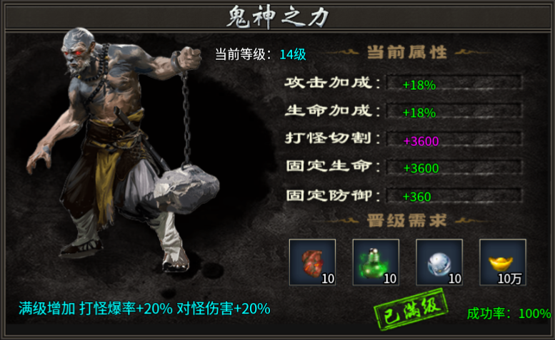 为提高打怪效率建议提升鬼神之力,可获得攻击、血量、切割、固定生命、固定防御等属性加成。