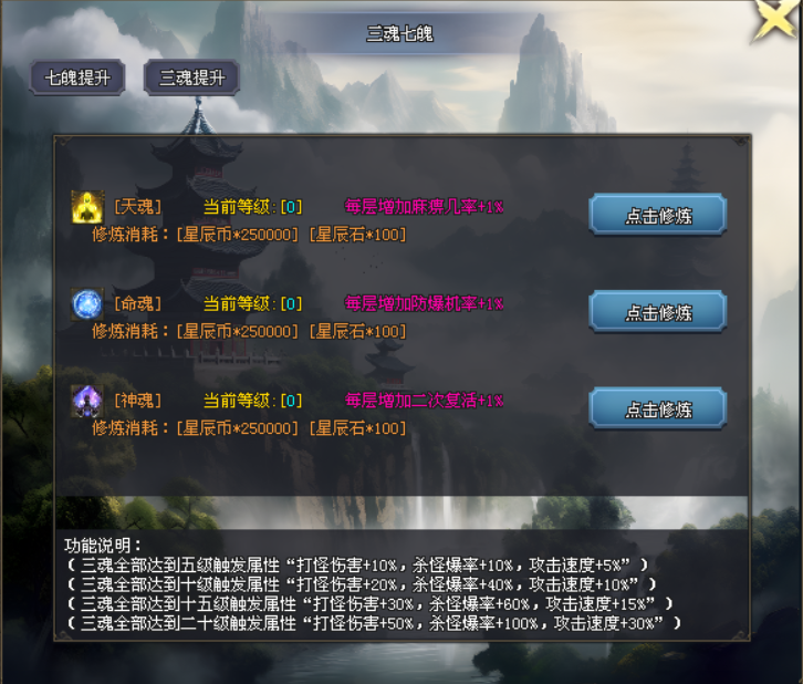 玩家可在一大陆使用货币及材料激活三魂七魄,获得大量属性加成,三魂全部达到一定等级还可激活攻速、爆率及打怪伤害加成。