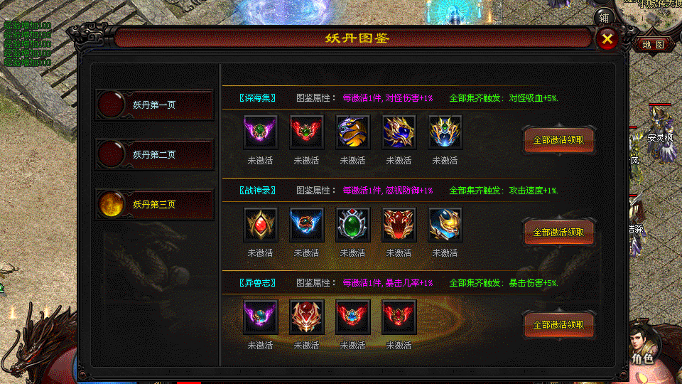 该版本设有多种妖丹、专属装备等多种图鉴收集玩法,激活图鉴,可获得大量属性加成。