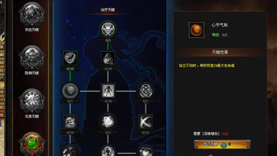 该版本新增天赋玩法,共有四种天赋体系,分别是:攻击天赋,防御天赋,元素天赋,治疗天赋。学习天赋需要消耗天赋点,打首领怪可以掉落天赋点材料,5个天赋点材料可以合成一个天赋点,右键点击天赋点材料,自动合成。