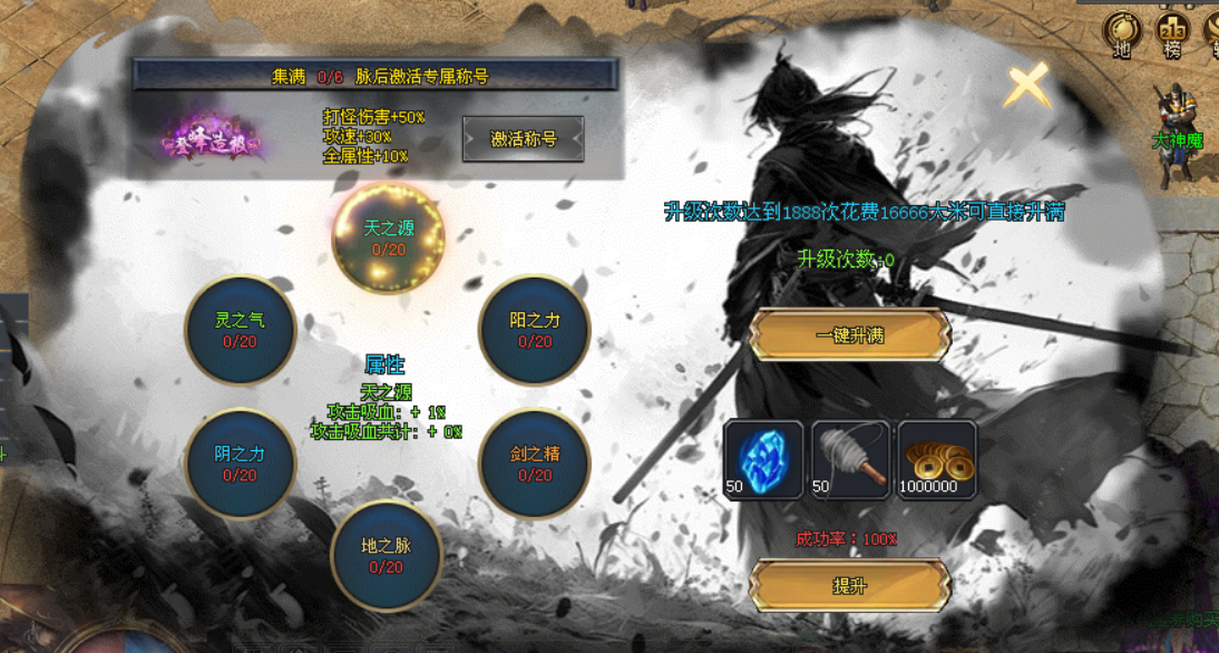 该版本新增天道传承玩法,通过消耗一定材料进行修炼,可获得百分比元素属性加成。