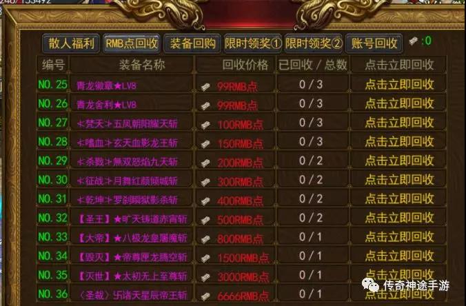 前期先在新人打宝地图打一套低阶装备,回收金币先升级坐骑(宝宝)和(斗笠)切割。之后金币可以先升称号,增加爆率,然后去称号地图打装备,有了一定的经济实力可以考虑升级时装(时装加爆率非常重要)和升级盾牌(盾牌攻速也非常重要),本服一切看脸,一切靠打,所有BOSS均可掉落顶级装备,只要时间多也能成神!
