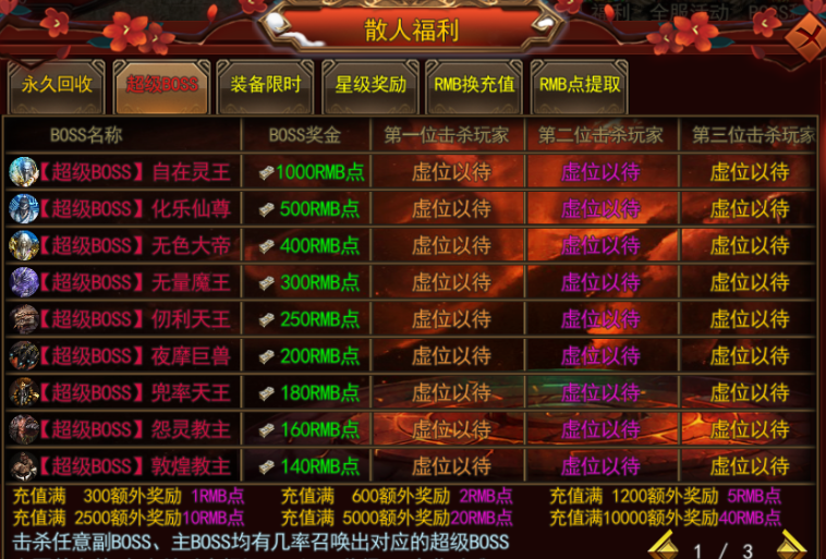 3、送自动回收、多种首杀首爆、永久回收奖励,BOSS爆充值,散人逆袭;