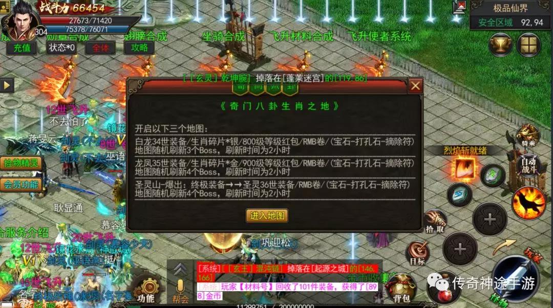 4、700级可进入奇门八卦地图,在这个地图可以合成生肖,生肖碎片各大BOSS都可以爆出,也可以NPC购买;