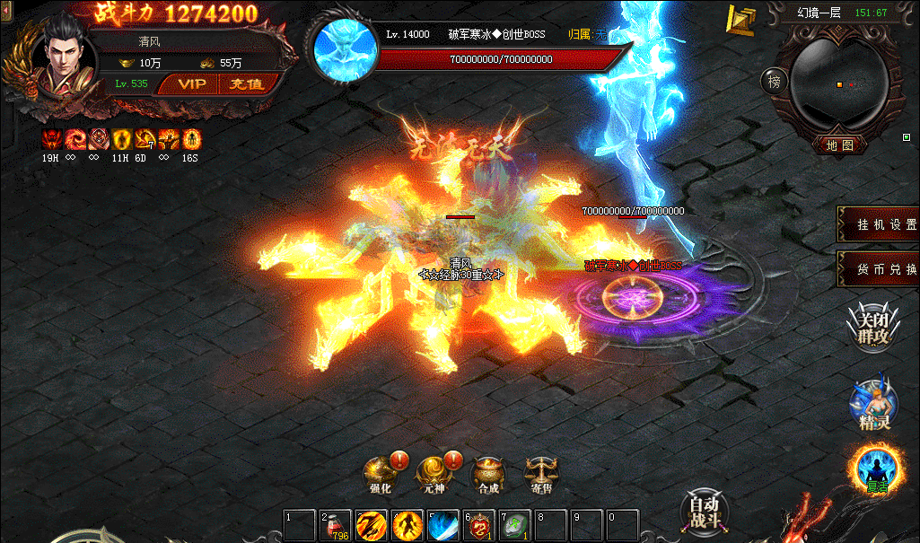 2、全屏烈焰环绕、炎龙击等群攻神技、战宠群攻群麻、打金效率高;