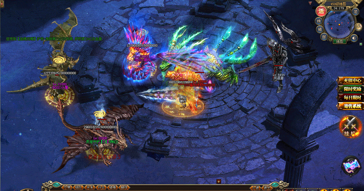3、多种限时及永久回收奖励,百种BOSS自由探索、充值爆满地,每天打千元;