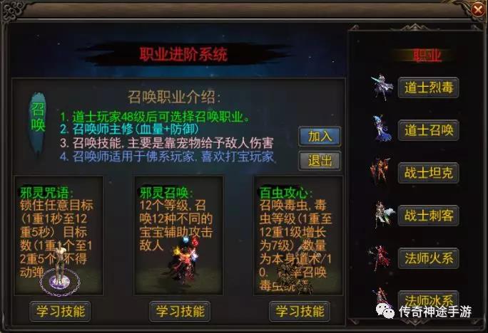 召唤师:可奴役召唤各种怪物辅助自身攻击(特色技能:邪灵咒语、邪灵召唤、百虫攻心)邪灵召唤技能有十二重,每一重都有对应的召唤宝宝,每一个宝宝都有特色的属性。