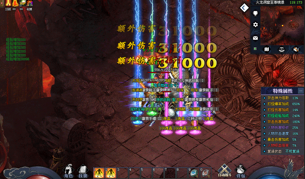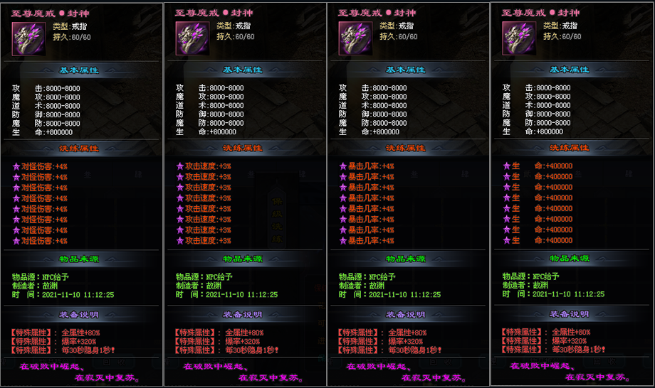 获得稀有装备一定要记得洗炼哦,洗到封神属性可额外加8条一样的属性,可以是8条爆率,8条攻速更可以是8条攻击,生命。