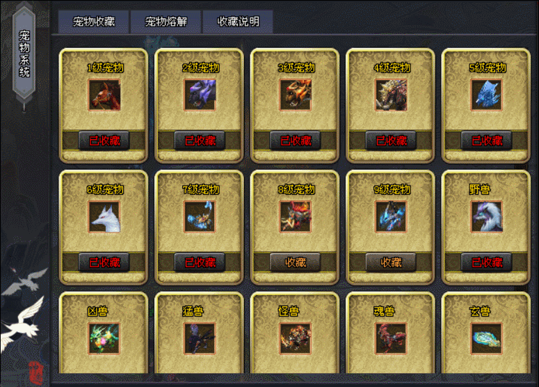 该版本设有几十张宠物神兽,每个怪物附加大量属性,收藏宠物可获得防御、爆率、回收加成、怪物盗取及五行属性加成。