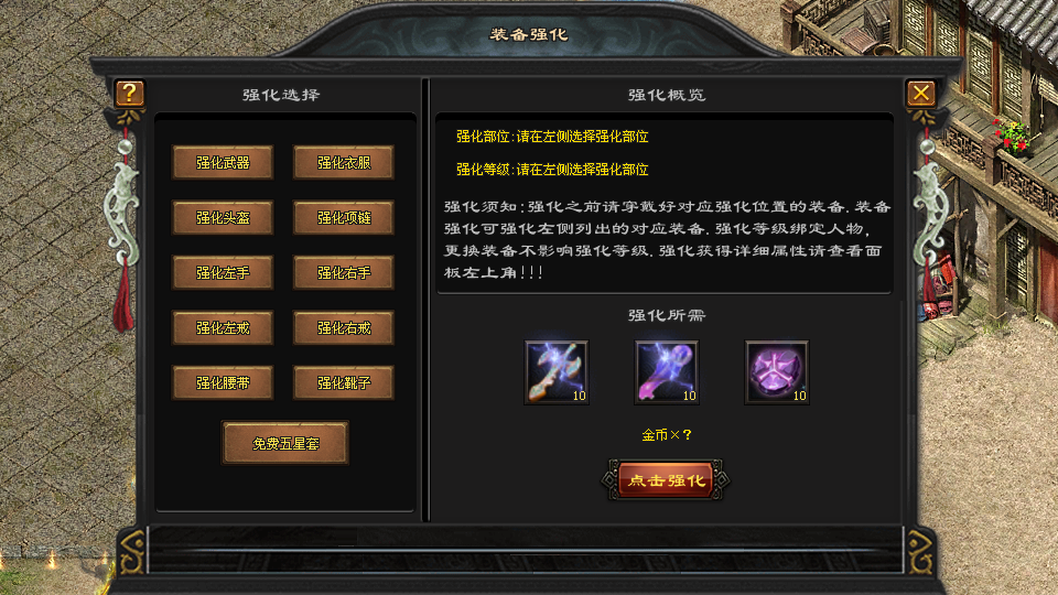 在边境小镇(第二大陆)安全区右侧装备强化NPC、沙漠绿洲(第三大陆)安全区下方装备强化3NPC、圣壁之都(第五大陆)安全区左侧装备强化5NPC处,装备强化等级绑定角色,更换装备不影响强化等级。强化前请穿戴好对应强化位置的装备,消耗虚空魔石、赞扎之光、赞扎之魂、金币强化任意装备部位,所有装备部位均强化至同一等级可获得套装属性加成,强化单个装备部位无额外属性加成,最高20级。拥有冠名称号后,可免费强化至5级。全部满级可获得对人/对怪减伤+20%、致命伤害+50%、最终生命+50%。