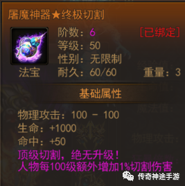 该版本上线直接领取屠魔神器-终极切割,无需任何合成升级,人物每提升100级额外增加1%的切割伤害,随着人物等级的提升切割攻击力越高。