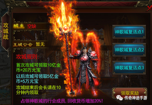 该版本神歌城攻城除了可领取大量金币及元宝奖励外,占领神歌城的行会,回收货币增加20%,此乃兵家必争之地,千万不可错过。