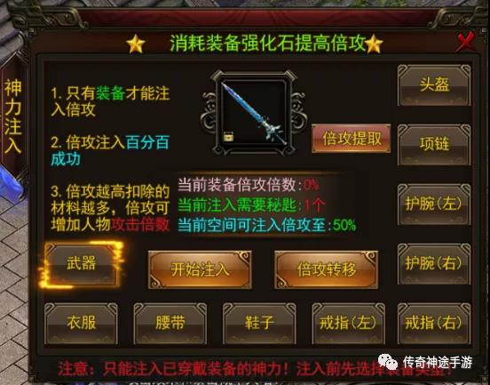 该版本独创神力注入玩法,装备可注入神力,神力可增加人物攻击倍数,注入越多,增加的越多,除此之外还有专属倍攻地图,爆率超高。