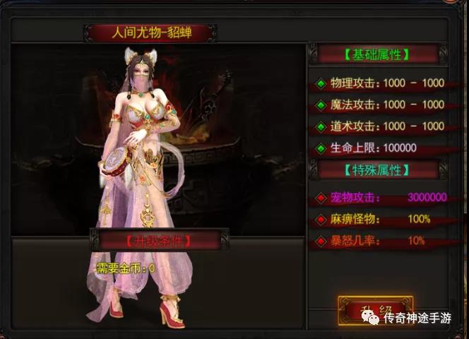 该版本升级神将可提升麻痹几率、攻击伤害及暴怒几率,美人使用金币进行升级。