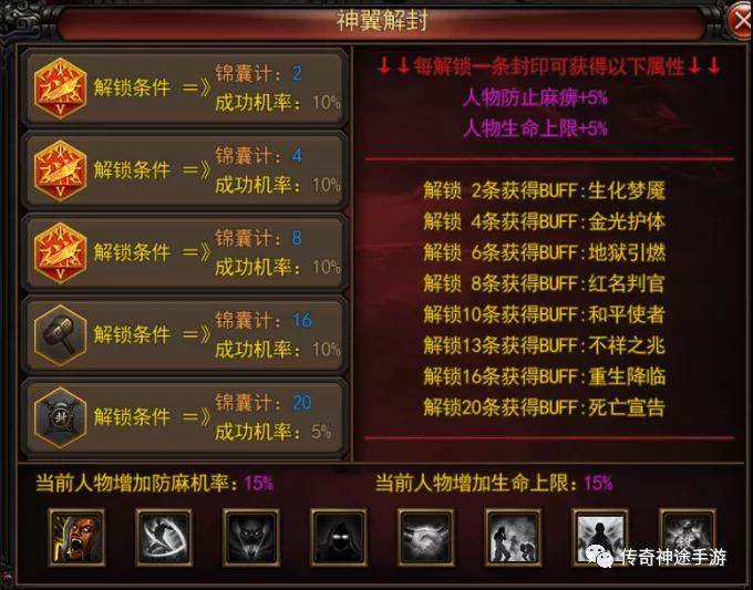 该版本神翼升满后,可开启神翼解封系统,解封可获得防麻痹属性,同时可开启超强特殊BUFF(秒怪BUFF、变猪、红名BUFF、和平BUFF,防爆、反伤等)。