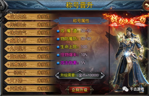 该版本升级称号可获得炫酷称号,同时还可获得攻击伤害及爆率等超强属性,装备满屏就靠它,前期建议优先升级,升级需要金币,打怪可直接获取。