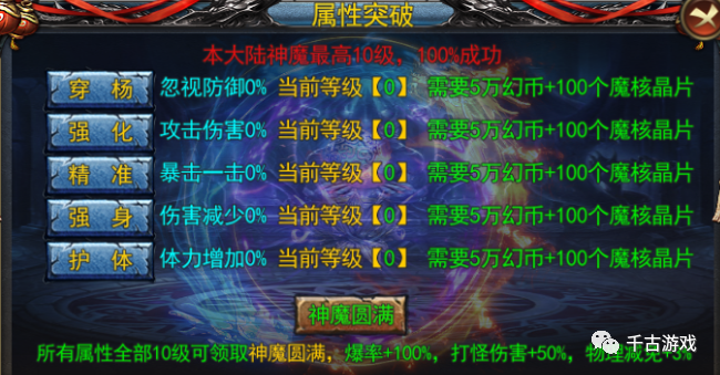 新增属性突破玩法,属性突破可获得大量属性加成,并且突破达到一定等级还可获得神魔圆满buff。