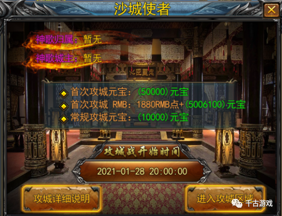 首攻奖励1880充值+50000元宝+沙城捐献奖池奖励。