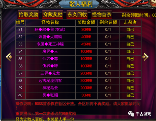 为了使散人更好的发展,游戏设有个人永久首杀及多种限时永久回收奖励,打到RMB点可直接兑换充值,散人打金好发展。