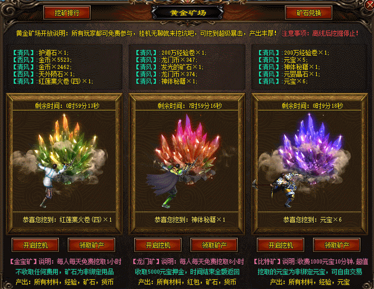 该版本新增特色挖矿玩法,一共设有三种挖矿玩法:金宝矿、龙门矿、比特矿。挖矿可获得各种元宝、金币、矿石、充值红包及各种材料!具体游戏内体验。
