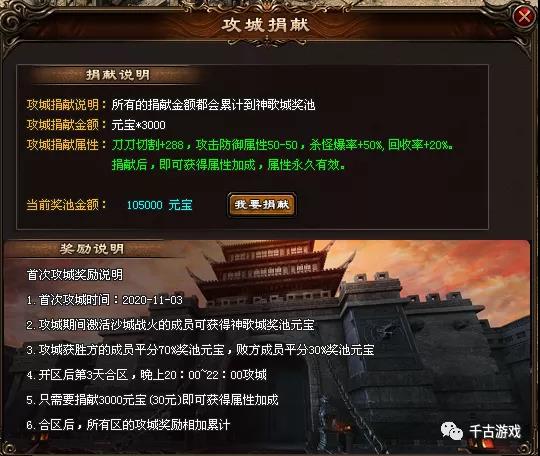 该版本开服第三天自动开启攻城,攻城奖励超高,不可错过。
