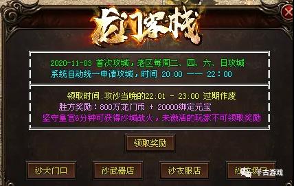 日常攻城奖励:800W龙门币+20000绑定元宝(奖励由系统自行分配,自己在npc处领取,会长固定6000)