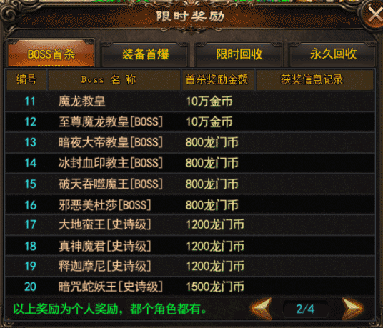 3、帐号保值、多种个人首杀首爆及永久回收,任意怪爆充值,散人逆袭;