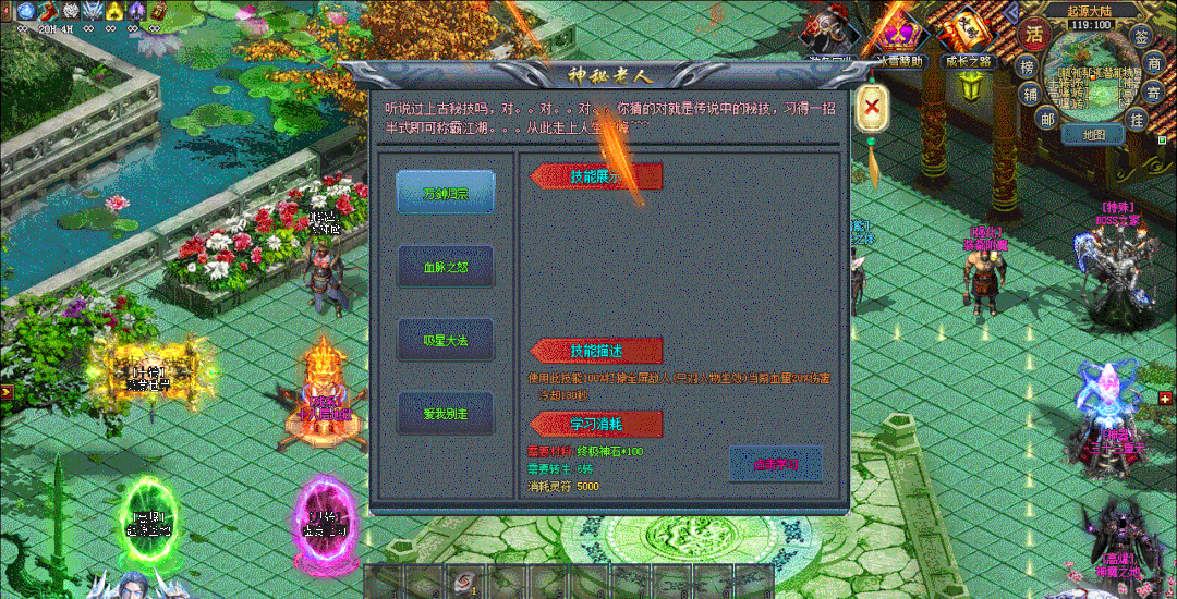 吸星大法:使用此技直接将范围10*10内的怪物吸到身边 冷却30秒;