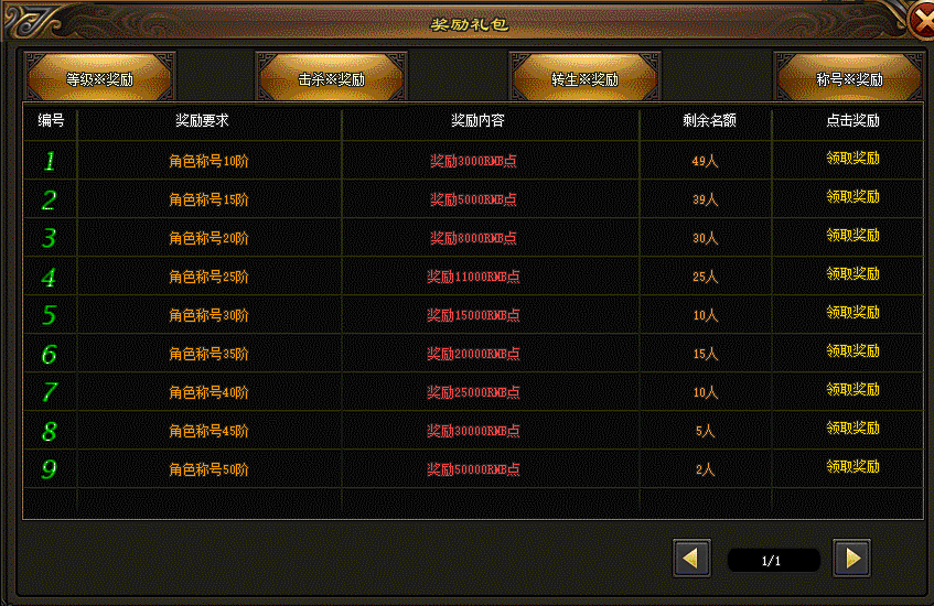 该版本等级、转生、称号、击杀指定BOSS达到要求,均可领取大量元宝、材料及充值奖励,散人努力轻松起飞。