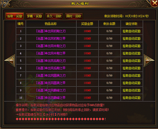 为了使散人更好的发展,游戏设多种个人限时及永久回收奖励,打到RMB点可直接兑换充值,散人打金好发展。