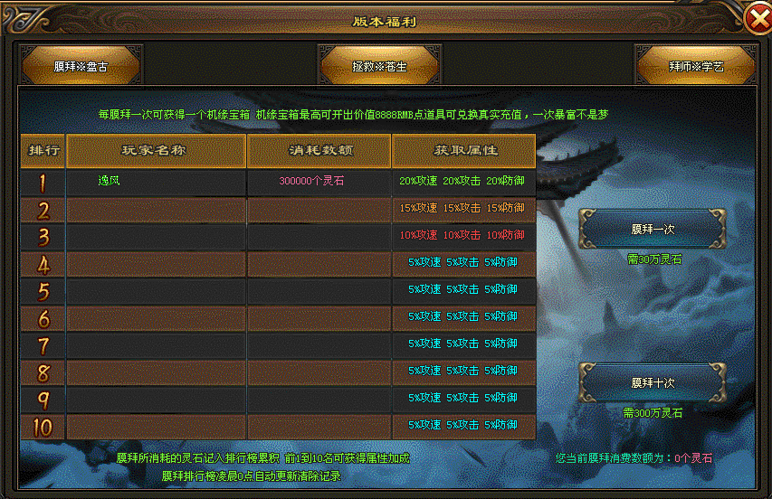 膜拜盘古:使用灵石膜拜盘古,可获得攻击防御及攻速加成,同时可获得机缘宝箱,可开出大量元宝及充值奖励。