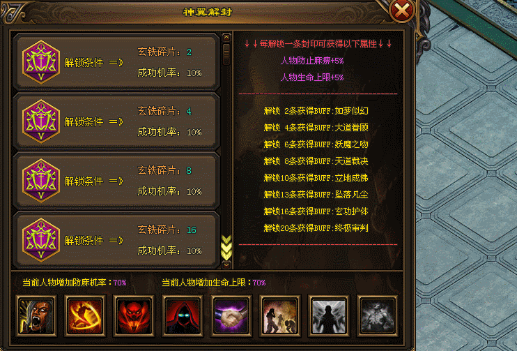 该版本神翼升满后,可开启神翼解封系统,解封可获得防麻痹属性,同时可开启超强特殊BUFF(秒怪BUFF、变猪、红名BUFF、和平BUFF,防爆、反伤等)。