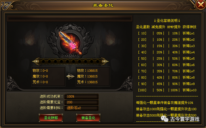 该版本装备可使用进阶石进行圣化,圣化可获得伤害减免、血量加成,还可获得逆流神技。